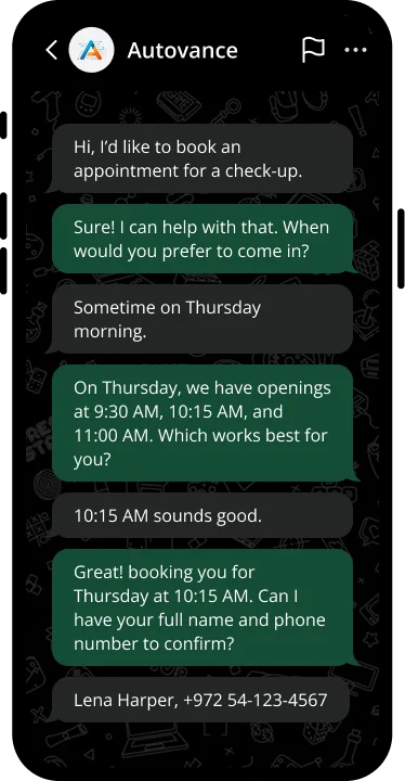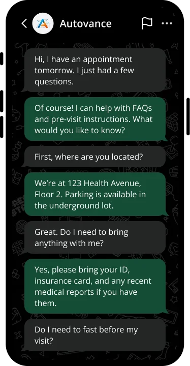 Automatically engage new leads — greet them, collect details, share resources, and offer appointment options. Turn first-time visitors into engaged clients, and engaged clients into long-term care relationships.